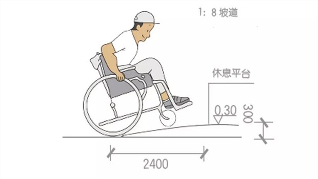 6.輪椅坡道起點(diǎn)、重點(diǎn)和中間休息平臺的水平長度不應(yīng)小于1.50m;