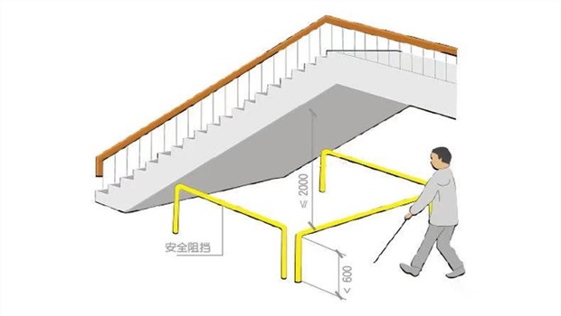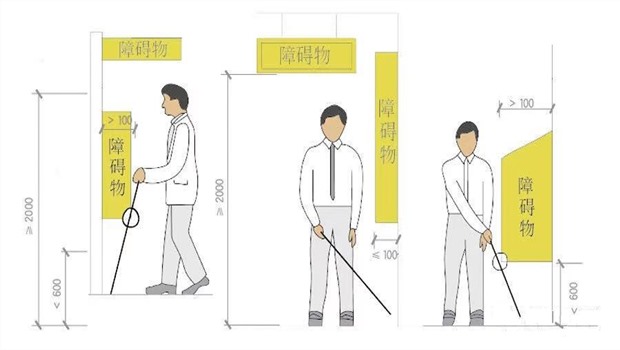 4.固定在無障礙通道的墻、立柱上的物體或標牌距地面的高度不應小于2.00m;如小于2.00時,探出部分的寬度不應大于100mm;如突出部分大于100mm,則其距地面的高度應小于600mm;