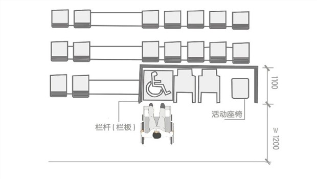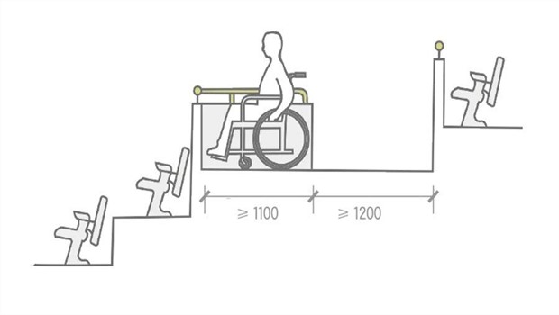 無障礙坐席 拓新盛達(dá) | 0 次訪問 | 2019-12-09 1.輪椅席位應(yīng)設(shè)在便于到達(dá)疏散口及通道的附近,不得設(shè)在公共通道范圍內(nèi)。 2.觀眾廳內(nèi)通往輪椅席位的通道寬度不應(yīng)小于1. 20m。 3.輪椅席位的地面應(yīng)平整、防滑,在邊緣處宜安裝欄桿或欄板。 4.每個(gè)輪椅席位的占地面積不應(yīng)小于1. 10m× 0. 80m。 5.在輪椅席位上觀看演出和比賽的視線不應(yīng)受到遮擋,但也不應(yīng)遮擋他人的視線。 6.在輪椅席位旁或在鄰近的觀眾席內(nèi)宜設(shè)置1 : 1 的陪護(hù)席位。 7.輪椅席位處地面上應(yīng)設(shè)置無障礙標(biāo)志。