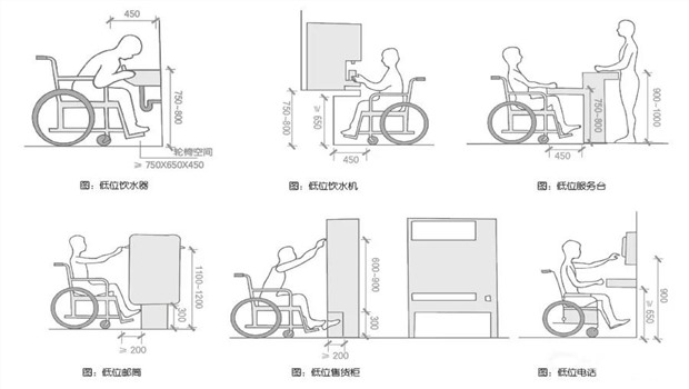 低位服務設施 拓新盛達 | 0 次訪問 | 2019-12-09 1.設置低位服務設施的范圍包括問詢臺、服務窗口、電話臺、安檢驗證臺、行李托運臺、借閱臺、各種業務臺、飲水機等; 2.低位服務設施上表面距地面高度宜為700mm~850mm ,其下部宜至少留出寬750mm ,高650mm ,深450mm 供乘輪椅者膝部和足尖部的移動空間; 3.低位服務設施前應有輪椅回轉空間,回轉直徑不小于1. 50m ; 4.掛式電話離地不應高于900mm 。